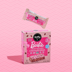 Our Barbie Chocolate Dream Crispy Squares have a base of chocolate crispy square that'smade with brown rice and topped with pink sprinkles for a better-for-you treat that's lower in sugar and super delicious.