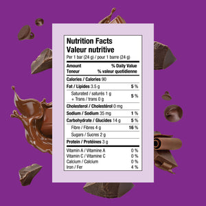 Gluten-free Oats, Brown rice, Tapioca fibre, Semi-sweet chocolate chips (unsweetened chocolate, sugar, cocoa butter), Sunflower seed, Rice Syrup, Rice protein, Vegetable glycerin, Rice flour, Sunflower oil, Cocoa powder, Natural flavour, Fruit and vegetable blend (apple, onion, broccoli, kale, cranberry, raspberry), Agar, Salt.