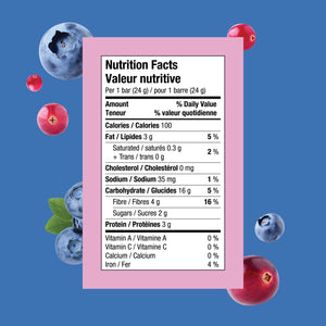 Gluten-free Oats, Tapioca fibre, Sunflower seeds, Brown rice, Vegetable glycerin, Rice Syrup, Rice Protein, Rice flour, currant, Sunflower oil, Apple Juice Concentrate, Cranberry, Blueberry, Natural flavour, Fruit and vegetable blend (apple, onion, broccoli, kale, cranberry, raspberry), Agar, Sugar, Salt.