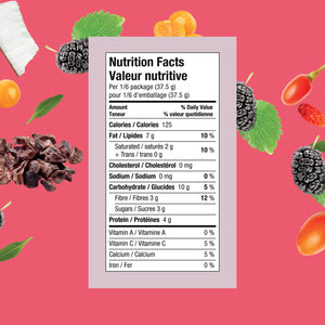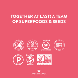 Sunflower Seeds, Pumpkin Seeds, Coconut, Mulberries, Golden Berries, Goji Berries, Cacao Nibs.